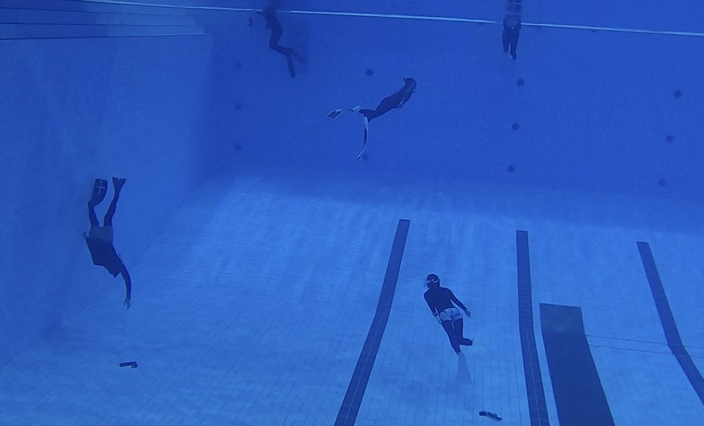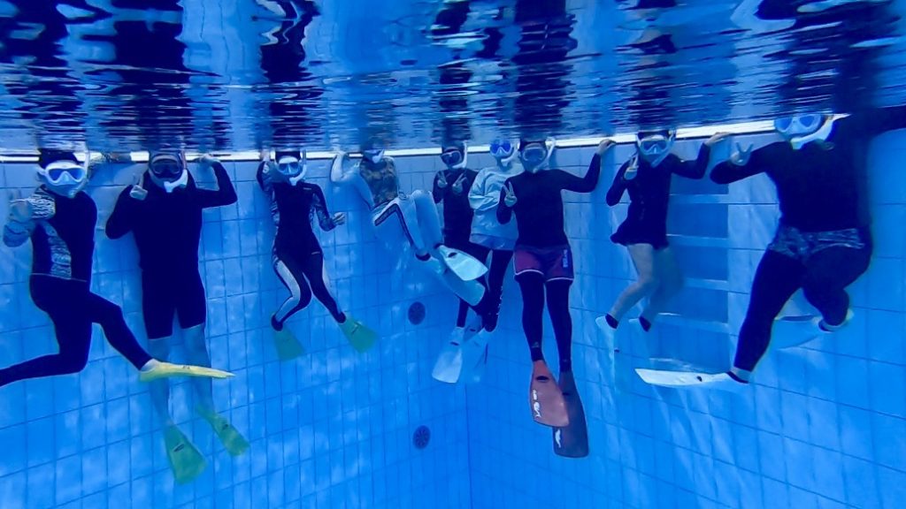 本日は新競技「水中ジムカーナ」(ダイビングプールの水中5x5x5メートルの立方体の各頂点を、定められた順に通過して速さを競うレース)を皆さんでトライしましたね!水底のターンポイントでの急旋回(約320度転回)からの斜め浮上、水面でスノーケルクリア・息継ぎした後にすぐに潜降、といったフィンワーク・俊敏性・持久力を含むスキンスキルの総合力が試されるエクササイズ。見事な身のこなしとフィン捌きで圧巻の泳ぎを披露されたY.Yさんが初代チャンピオンに輝きました(ルート2周のタイム 1分24秒)!!おめでとうございます。記録はこれから更新されるでしょうか、楽しみですね!またの講習でお待ちしてます!(タカ)