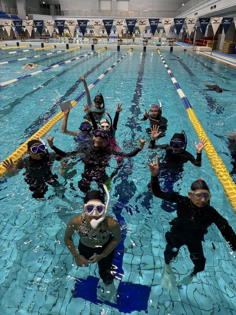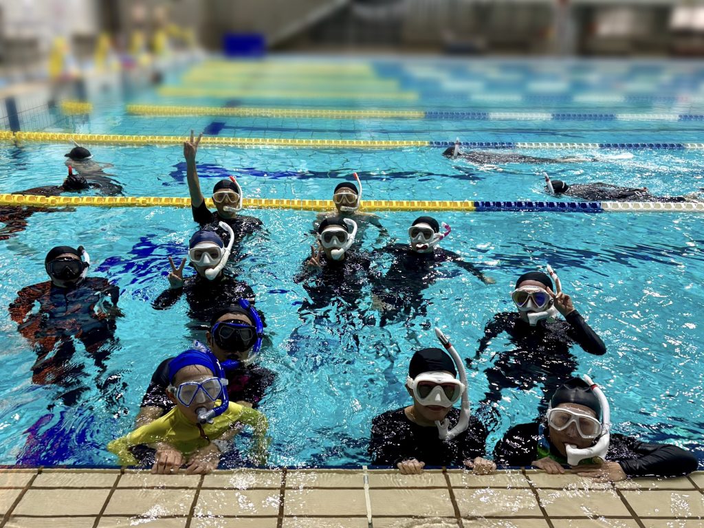 本日は浅いプール。スノーケルクリアやマスククリアは足の届く安心感があると、落ち着いて練習できます。とはいえ初めはやはり大変。スノーケルクリアで水が抜けない、マスククリアで水が残る…などは必ず原因があります。そしてコツもあります。空気のお団子をボンと吐く感じや、鼻息を少しづつ長めに吐くなど試してみましょう!皆さま次は基礎編にご参加ください!繰り返し練習をたくさんして、スキルアップしましょう!本日はご参加ありがとうございました!