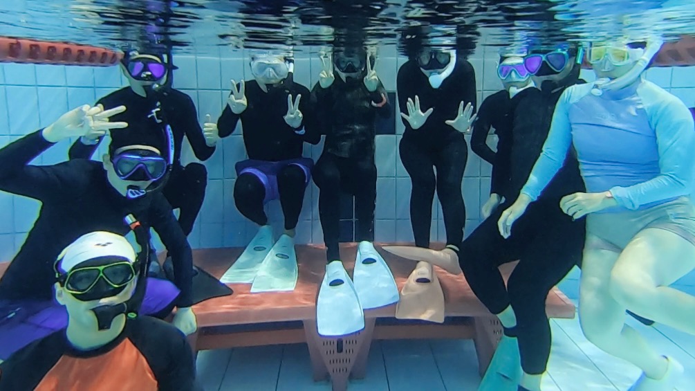 土曜日開催!今日は都内にあります水深1.4mプールで、スノーケリング・スキンダイビング講習会の基礎編・応用編を開催!9名様にご参加いただきました!(^_-)-☆