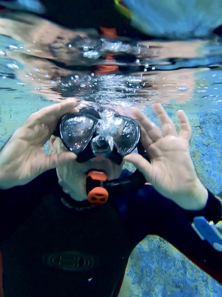 マスククリアはマスクがキツ過ぎたり、鼻の下を開けすぎたり、鼻息が強すぎても上手くできません。これは水中でマスクを外し、また着けてマスククリアをする時も同じです!マスクを「水中」で「外す」と考えると気持ちが焦ってしまうだけなので落ち着けば大丈夫ですよ。ウェットスーツでウエイトを着けて潜ると、いつもと違いましたね(・∀・)海だと波や流れがありさらに潜りにくくなりますが、今まで以上に垂直に潜る意識をしてみてください。ウエイトは少なめで大丈夫だと、今回確認できてよかったです。ドルフィンキックは潜水25mなどの練習の時にぜひトライしてみてください。手は前に伸ばすのが楽でしたね。これから海に行かれるまでの間、またグループレッスンにもいらしてくださいね!本日はご参加ありがとうございました!