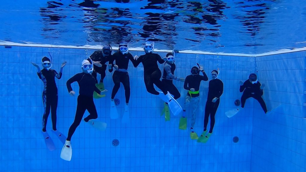 さて、今日は都内にある水深5mの大型ダイビングプールで、スノーケリング・スキンダイビング講習会の入門編・基礎編・応用実践編を開催!平日にも関わらず23名様にご参加いただきました!(*^^*)