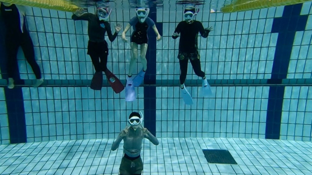 さて今日は横浜国際プールのサブプールで、スノーケリング・スキンダイビング講習会の応用編を開催!4名様にご参加いただきました!(^^♪