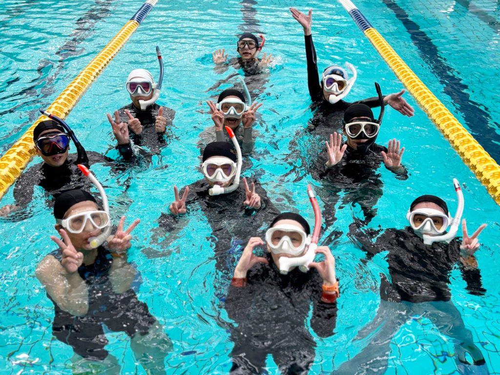 今日は横浜国際プールのサブプールで、スノーケリング・スキンダイビング講習会の基礎編・応用編を開催!満員御礼の10名様にご参加いただきました!(^^♪