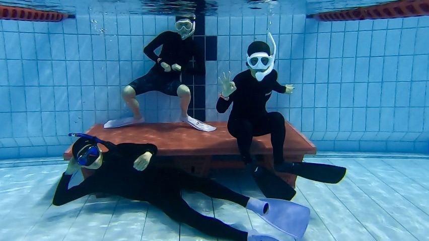 基礎編はヘッドファースト、耳抜き、呼吸のコントロール、潜水、そして置換法(ディスプレイスメント法)のスノーケルクリア!ヘッドファーストは上半身を綺麗に折り込めています!ダイビングプールでの練習ですんなり潜れそうでしたね!耳抜きは引き続き焦らず試してみましょう。息は吸いすぎずに!仰る通り、スノーケルクリアができる息を残して潜ることが大切です!置換法もすぐにできちゃいましたね(*´∀`)